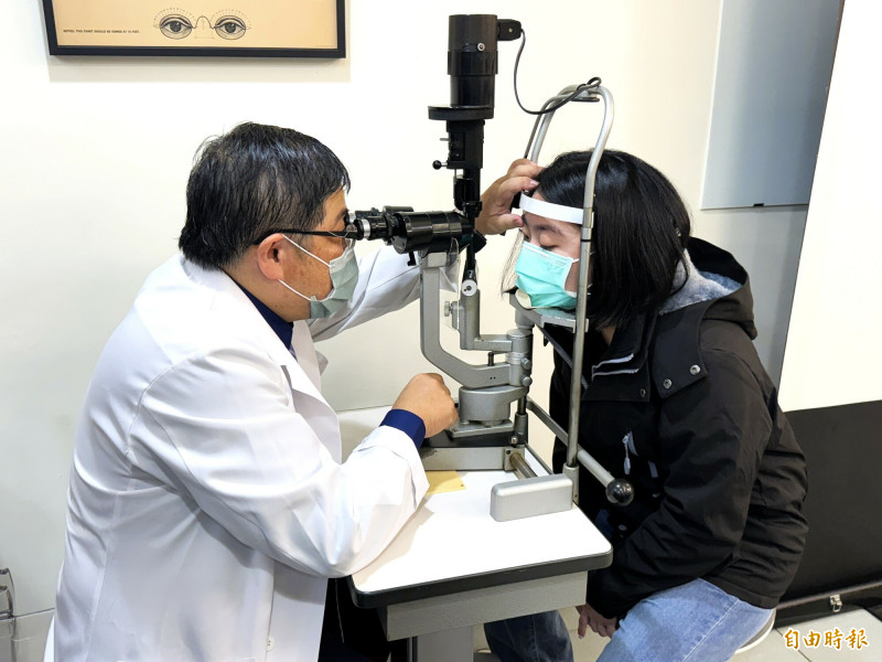 眼科醫師洪啟庭為林小姐檢查眼睛,但也提醒高膽固醇或高三酸甘油脂等問題,可自行在家照鏡子檢查,發現異常及早就醫抽血檢查。(記者許麗娟攝)