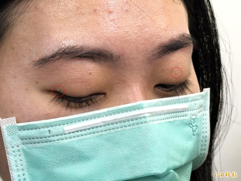 林小姐約1年半前雙眼出現眼瞼黃斑瘤,雖經挑除及改善飲食、降低膽醇,但近期也有再復發的狀況(圖紅圈處)。(記者許麗娟攝)