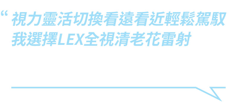 可真正改善老花眼問題,也能同時解決近視、散光,多焦點的人工水晶體可以調節遠、中、近的視力,一般坊間的老花雷射是將一眼留近視度數,一眼雷射到沒度數,但過了2-3年後老花眼的度數仍舊會增加,並不是真正的「打掉老花」,且所費昂貴。「LEX全視清老花雷射」是將老花、近視、散光度數都放在具有調節遠、中、近的人工水晶體內,將彈性變差有老花的水晶體替換掉,而且未來也不用再擔心有白內障的問題,一次性全面提高視力品質,擺脫眼鏡束縛。